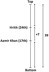 Hritik is 7th ranks ahead of Aamir Khan in a class of 39. If Aamir Khan’s rank is 17th from the last, what is Hritik’s rank from the start?