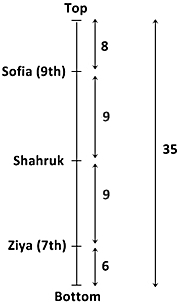 As seen in the figure, Shahruk is between Sofia and Ziya. It's given that Ziya is 7th from the bottom and Sofia is 9th from the top. Therefore, number of persons between Sofia and Ziya = 35 - (9 + 7) = 19 Sharuk's position between Sofia and Ziya = 19 + 1/2 = 10 Hence, Shahruk is at the middle i.e. at 10th position from both. Ziya, therefore, is at the 10th position from Shahruk.