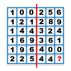 Split the grid in half vertically, to give two columns, 3 squares wide. Working from top to bottom, left then right, and reading each 3 square row as a whole 3 digit number, the columns follow the sequence of square numbers, from 10 to 21. So, last three digit number would be square of 21. 21 * 21 = 441. Missing Element = 1.