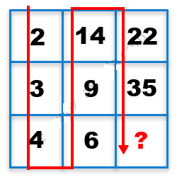 Starting at the top left and moving down, then to the right and up, in a snakes and ladders pattern, add the first two numbers together and subtract 1 to get the next in the sequence. So,Missing Number = 22 + 35 - 1 = 56
