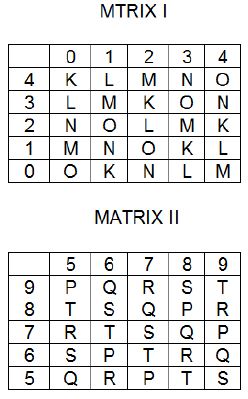 word is represented by only one set of numbers as given in any one of the alternatives. The sets of numbers given in the alternatives are represented by two classes of alphabets as in two matrices given below. The columns and rows of Matrix I are numbered from 0 to 4 and that of Matrix II are numbered from 5 to 9 A letter from these matrices can be represented first by its row and next by its column, e.g., ‘N’ can be represented by 43,34, etc., and ‘R’ can be represented by 97,68, etc. Similarly, you have to identify the set for the word given ‘POLO’.