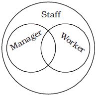 Some workers may be managers and vice–versa. All workers and managers are staff.