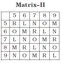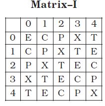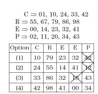 A word is represented by only one set of numbers as given in any one of the alternatives. The sets of numbers given in the alternatives are represented by two classes of alphabet as shown in the given two matrices. The columns and rows of Matrix-I are numbered from 0 to 4 and that of Matrix- II are numbered from 5 to 9. A letter from these matrices can be represented first by its row and next by its column, for example ‘X’ can be represented by 21, 44 etc. and ‘R’ can be represented by 67, 98 etc. Similarly, you have to identify the set for the word ‘CREEP’.