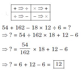 If “+” denotes “divided by”, “×” denotes “added to”, “÷” denotes “subtracted from” and “–” denotes “multiplied by”, then 54 + 162 – 18 × 12 ÷ 6 = ?