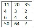 The pattern is as follows, In first column: (11 × 4) + 6 = 50 In second column: (20 × 3) + 4 =64 Thus in third column: (35 × 2) + 3 = 73 Hence missing number is 73.