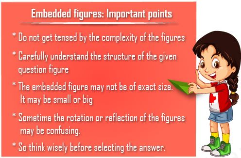 Embedded figures are the figures hidden inside another figure. In other words, a figure (x) is said to be embedded inside figure (y), if figure (y) contains figure (x) in it. Embedded figure questions consist of unique figure which is hidden or embedded in one of the four option figures. In such questions, all the options look same and confusing. So candidates need to be careful while attempting such questions. Anyhow with practice we can master these embedded figures. We must basically understand the structure of the given question figure and then proceed to find the correct answer figure.
