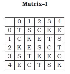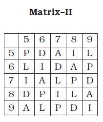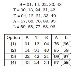 A word is represented by only one set of numbers as given in any one of the alternatives. The sets of numbers given in the alternatives are represented by two classes of alphabet as shown in the given two matrices. The columns and rows of Matrix-I are numbered from 0 to 4 and that of Matrix-II are numbered from 5 to 9. A letter from these matrices can be represented first by its row and next by its column, for example ‘C’ can be represented by 10, 34 etc and ‘D’ can be represeted by 85, 98 etc. Similarly, you have to identify the set for the word ‘STEAL’.