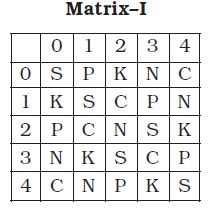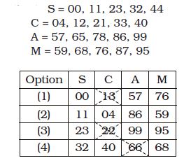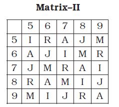 A word is represented by only one set of numbers as given in any one of the alternatives. The sets of numbers given in the alternatives are represented by two classes of alphabet as shown in the given two matrices. The columns and rows of Matrix-I are numbered from 0 to 4 and that of Matrix-II are numbered from 5 to 9. A letter from these matrices can be represented first by its row and next by its column, for example, ‘K’ can be represented by 10, 31 etc and ‘M’ can be represeted by 76, 87 etc. Similarly, you have to identify the set for the word ‘SCAM’.