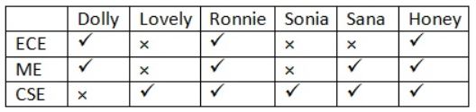 There are six professors taking lectures in different branches of engineers. Dolly is teaching in CSE. Lovely and Sana are not teaching in ECE. Sonia is not teaching in ME. Dolly and Sonia are not teaching in ECE. Dolly and Lovely are not teaching in same branch. There are two faculties Ronnie and Honey, who teaches in all the three branches and there is only one faculty two teaches in exactly two branches.