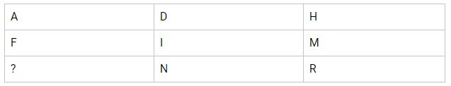 The letters in the second and third rows are five steps ahead of those in the first and second rows respectively. So, the missing letter will be five steps ahead of F, which is K.