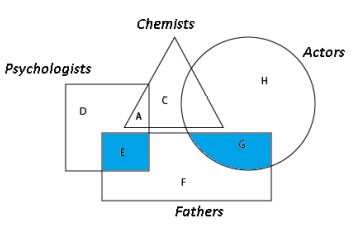 Psychologists and actors who are also fathers are represented by blue area = E + G