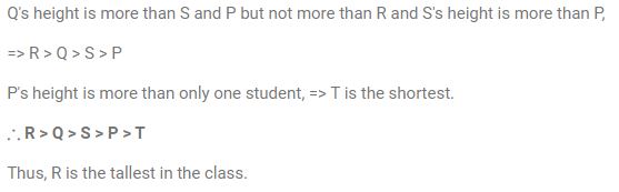 There are ve students - P, Q, R, S and T having different heights in a class. P's height is more than only one student. Q's height is more than S and P but not more than R. S's height is more than P. R is not the smallest. Who is having the maximum height in the class?