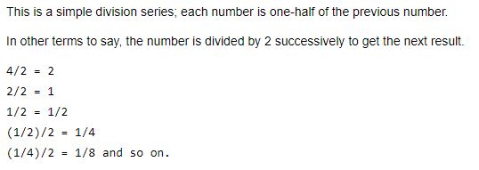 Look at this series: 2, 1, (1/2), (1/4), ... What number should come next?