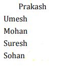 Five boys are standing in a row facing west. Mohan is standing between Umesh and Suresh. Prakesh is standing to the immediate right of Umesh. Sohan is standing at extreme left of the row. Who is standing at the other end of the row?