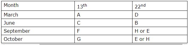 There are 8 friends – A, B, C, D, E, F, G and H who have their birthdays in four months – March, June, September and October on either 13th or 22nd of the month. F has his birthday on 13th of a month having 30 days. A and D have their birthday in same month with A having birthday before. There are two people who have birthdays between A and B. C’s birthday is in June. H has his birthday on 22nd of a month. E does not have his birthday on 13th. G does not have his birthday in March.