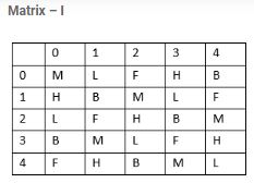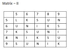 A word is mentioned only by a group of numbers, as shown in one of the options. The number groups in the options are mentioned by two classes of letters as shown in Matrices given below. The no. of rows & columns in Matrix I are from 0- 4 & that of in Matrix II are 5-9. A letter can be de?ned using the no. of row & then the no. column. e.g. ‘F’ can be de?ned by 02, 14, 33 etc. & ‘K’ by 56, 68, 87 etc. Find the code/group of numbers for the given word BUSH.