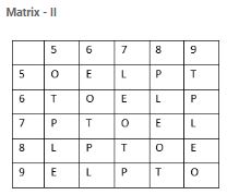 A word is mentioned only by a group of numbers, as shown in one of the options. The number groups in the options are mentioned by two classes of letters as shown in Matrices given below. The no. of rows & columns in Matrix I are from 0- 4 & that of in Matrix II are 5-9. A letter can be de?ned using the no. of row & then the no. column. e.g. ‘A’ can be de?ned by 00, 12, 23 etc. & ‘P’ by 58, 69, 75 etc. Find the code/group of numbers for the given word.