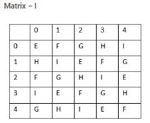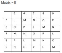 A word is mentioned only by a group of numbers, as shown in one of the options. The number groups in the options are mentioned by two classes of letters as shown in Matrices given below. The no. of rows & columns in Matrix I are from 0- 4 & that of in Matrix II are 5-9. A letter can be de?ned using the no. of row & then the no. column. e.g. ‘F’ can be de?ned by 01, 13 etc. & ‘P’ by 66, 78 etc. Find the code/group of numbers for the given word MEN.