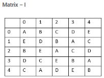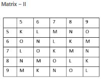 A word is mentioned only by a group of numbers, as shown in one of the options. The number groups in the options are mentioned by two classes of letters as shown in Matrices given below. The no. of rows & columns in Matrix I are from 0- 4 & that of in Matrix II are 5-9. A letter can be de?ned using the no. of row & then the no. column. e.g. ‘A’ can be de?ned by 00, 13 etc. & ‘K’ by 55, 68 etc. Similarly, Find the code/group of numbers for the given word DEMO.