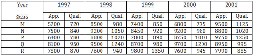 Number of candidates appeared and qualified in a competitive examination from different states over the years.