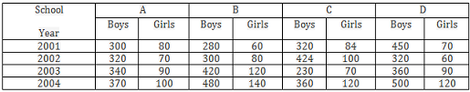 The following table shows the number of boys and girls of different schools that have participated in a scholarship test over five years.