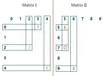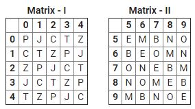 A word is represented by only one set of numbers as given in any one of the alternatives. The sets of numbers given in the alternatives are represented by two classes of alphabets as in two matrices given below. The columns and rows of Matrix I are numbered – form 0 to 4 and that Matrix II are numbered from 5 to 9. A letter from these matrices can be represented first by its row and next by its column, e.g., ‘J’ can be represented by 01, 14, etc. and E can be represented by 55, 66 etc. Similarly, you have to identify the set for the word ‘OBJECT’.