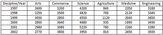 Study the following table carefully to answer these questions: Number of students studying different disciplines at graduate level from State A over the years.