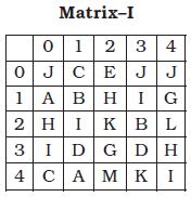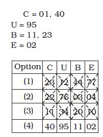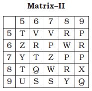 A word is represented by only one set of numbers as given in any one of the alternatives. The sets of numbers given in the alternatives are represented by two classes of alphabet as shown in the given two matrices. The columns and rows of Matrix-I are numbered from 0 to 4 and that of Matrix-II are numbered from 5 to 9. A letter from these matrices can be represented first by its row and next by its column, for example ‘K’ can be represented by 22, 43 etc. and ‘Z’ can be represented by 65, 77 etc. Similarly, you have to identify the set for the word ‘CUBE’.