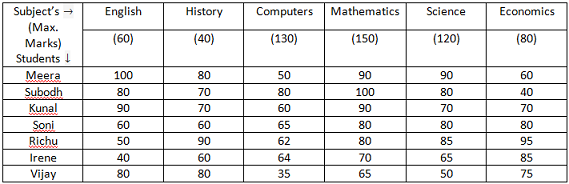 Study the following table to answer the given questions: Percentage of marks obtained by seven students in six subjects.