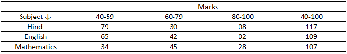 Study the following table carefully to answer these questions: Distribution of marks obtained by 160 students in each of the three subjects--- Hindi, English and Maths --- out of 100.