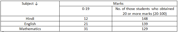 Study the following table carefully to answer these questions: Distribution of marks obtained by 160 students in each of the three subjects--- Hindi, English and Maths --- out of 100.