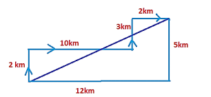 A man travels 2 km to the north and turns east and travels 10 km and again he turns north and travels 3 km and again turns to east and travels 2 km. How far is he from the starting point ?