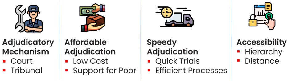 Meaning: It is a basic principle of the rule of law and deals with the ability of people to seek and obtain a remedy through formal or informal institutions of justice for grievances.
