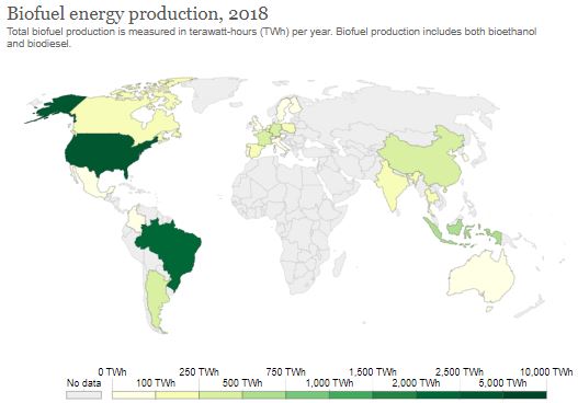Liquid biofuels are of particular interest because of the vast infrastructure already in place to use them, especially for transportation. The liquid biofuel in greatest production is ethanol (ethyl alcohol), which is made by fermenting starch or sugar. Brazil and the United States are among the leading producers of ethanol. In the United States ethanol biofuel is made primarily from corn (maize) grain, and it is typically blended with gasoline to produce “gasohol,” a fuel that is 10 percent ethanol. In Brazil, ethanol biofuel is made primarily from sugarcane, and it is commonly used as a 100-percent-ethanol fuel or in gasoline blends containing 85 percent ethanol. Unlike the “first-generation” ethanol biofuel produced from food crops, “second-generation” cellulosic ethanol is derived from low-value biomass that possesses a high cellulose content, including wood chips, crop residues, and municipal waste. Cellulosic ethanol is commonly made from sugarcane bagasse, a waste product from sugar processing, or from various grasses that can be cultivated on low-quality land. Given that the conversion rate is lower than with first-generation biofuels, cellulosic ethanol is dominantly used as a gasoline additive.