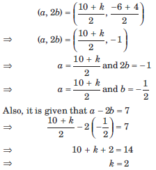 (a, 2b) is the mid-point of the line segment joining the points (10, −6) and (k, 4). If a − 2b = 7, then what is the value of k?
