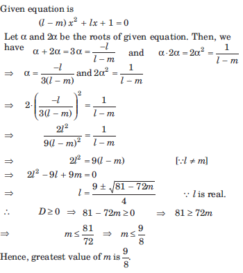 If one root of the equation (l − m)x2 + lx +1 = 0 is double the other and l is real, then what is the greatest value of m?