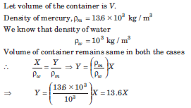 A container is first filled with water and then the entire water is replaced by mercury. Mercury has a density of 13.6 x 103 kg/m3 . If X is the weight of the water and Y is the weight of the mercury, then