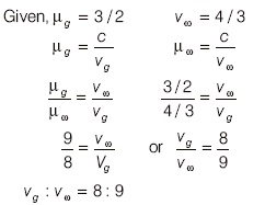 If the absolute refractive indices of glass and water are 3/2 and 4/3 respectively, what will be the ratio of velocity of light in glass and water?