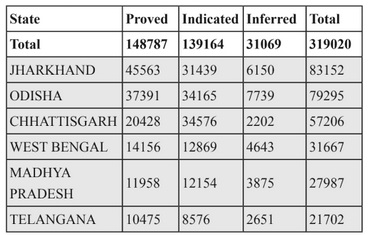 As a result of exploration carried out up to the maximum depth of 1200m by the GSI, CMPDI, SCCL and MECL etc, a cumulative total of 319.02 Billion tonnes of Geological Resources of Coal have so far been estimated in the country as on 1.4.2018. The details of state-wise geological resources of Coal (in million tonnes) are given as under