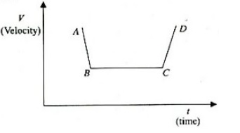 In path A -> B velocity is decreasing with time, therefore AB represents deceleration. In path B -> C velocity is constant with time. In path C -> D velocity is increasing with time, therefore CD represents acceleration.