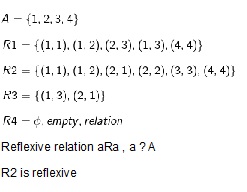 Find the reflexive relation set on the set A 1 2 3 4 R1 1 1 1 2 2 3 1 3 4 4 R2 1 1 1 2 2 1 2 2 3 3 4...........
