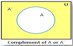 The complement of a set A relative to universal set U is the set of all points which do not belongs to A and which, of course, belong to U.It is denoted by U – A or A’.