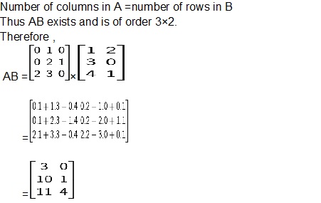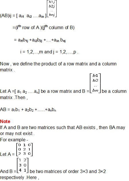 Two matrices A and B are conformable for the product AB if the number of columns in A (pre -multiplier ) is same as the number of rows in B (post-multiplier ).Thus , if A =[aij]m×n and B =[bij]n×p are two matrices of order m×n and n×p respectively , then their product AB is of order m×p and is defined as