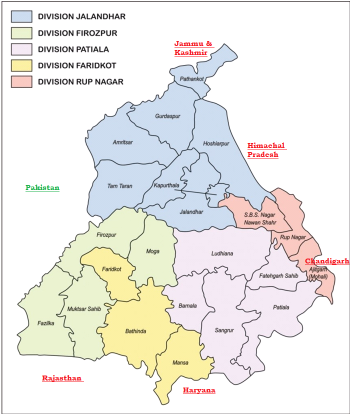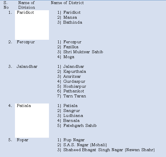 There are 5 Administrative Divisions and 22 Districts in Punjab. Ropar Division- It was declared as division on 31st December 2010 By CM Prakash Singh Badal. Earlier it was a part of Patiala Division. The new Ropar division comprises Rupnagar, SBS Nagar (Nawanshahr) and SAS Nagar (Mohali) districts.