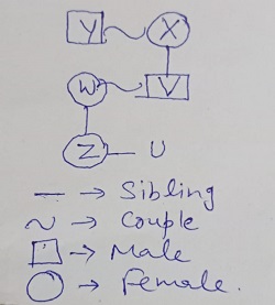 Study the following information and answer the questions given below : There are two married couples in the family of six people (U,V,W,X,Y and Z) W is the wife of V and the mother of Z, X is the grandmother of U and the mother of V. Z is the granddaughter of Y