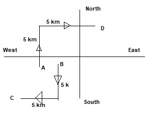 Correct option 3: The houses of C and D are less than 20 km apart The houses of A and B face each other on a road going north-south, A's being on the western side. A comes out of his house, turns left, travels 5 km, turns right, travels 5 km to the front of D's house. B does exactly the same and reaches the front of C's house. The diagram is as follows: