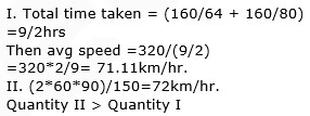 Quantity I: one day Sandeep on tour travels first 160 km at 64 km/hr and the next 160 km at 80 km/hr. The average speed of the tour is: