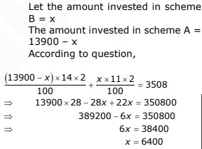 Mr. Thomas invested an amount of 13,900/- divided in two different schemes A and B at the simple interest rate of 14% p.a. and 11% p.a. respectively. If the total amount of simple interest earned in 2 years be 3,508/- what was the amount invested in Scheme B?
