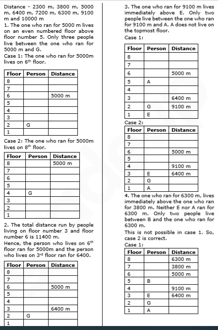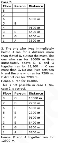 Study the given information carefully to answer the given questions. Eight people A, B, C, D, E, F, G and H lives on eight different floors of a building but not necessarily in the same order. The lowermost floor of the building is numbered one, the one above that is numbered two and so on till the topmost floor is numbered eight. Each one of them ran for a different distance in a marathon – 2300 m, 3800 m, 5000 m, 6400 m, 7200 m, 6300 m, 9100 m and 10000 m but not necessarily in the same order. The one who ran for 5000 m lives on an even numbered floor above floor number 5. Only three people live between the one who ran for 5000 m and G. The one who ran for 9100 m lives immediately above E. Only two people live between the one who ran for 9100 m and A. A does not live on the topmost floor. The total distance run by people living on floor number 3 and floor number 6 is 11400 m. The one who ran for 6300 m, lives immediately above the one who ran for 3800 m. Neither E nor A ran for 6300 m. Only two people live between B and the one who ran for 6300 m. The one who lives immediately below D ran for a distance more than that of B, but not the most. No one lives between H and the one who ran for 7200 m. E did not ran for 7200 m. The one who ran for 10000 m lives immediately above D. C and G together ran for 16,300 m. C ran more than G.