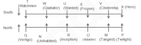 Study the given information carefully and answer the given questions. Twelve people are sitting in two parallel rows containing six people each, in such a way that there is an equal distance between adjacent persons. In row-1 S, T, U, V, W and X are seated and all of them are facing south. In row-2 M, N, O, P, Q and R are seated and all of them are facing north. Therefore in the given seating arrangement, each member seated in a row faces another member of the other row. No two people with names starting with consecutive neighbor of each other. For e.g. A is not an immediate neighbor of B. B is not an immediate neighbor of either A or C and so on. Each of them also likes a different movies viz. Vertigo, Cinderella, Twilight, Gladiator, Uninhabited, Inception, Frozen, Watchmen, Tangled, Aladdin, Hero and Wanted.